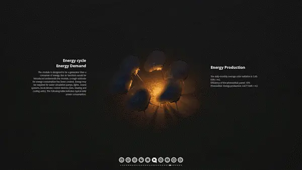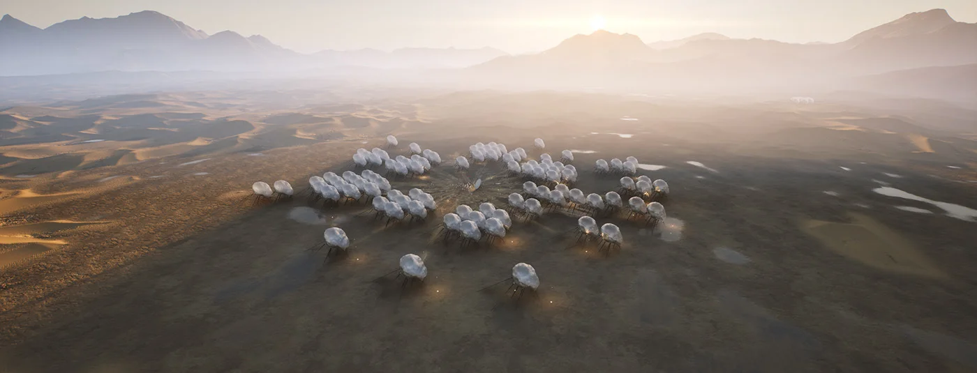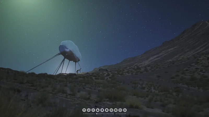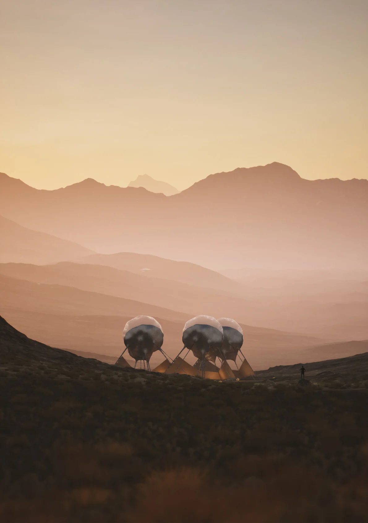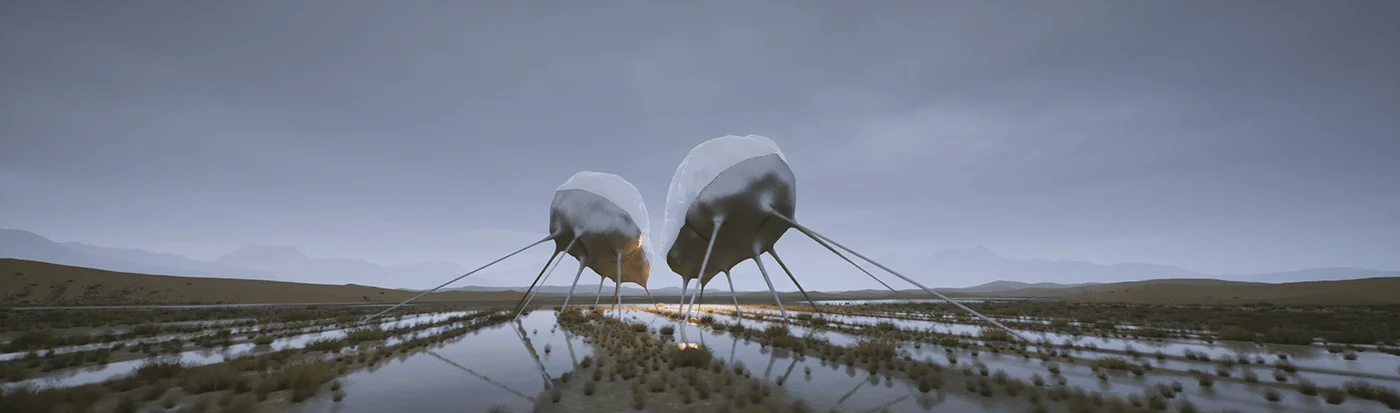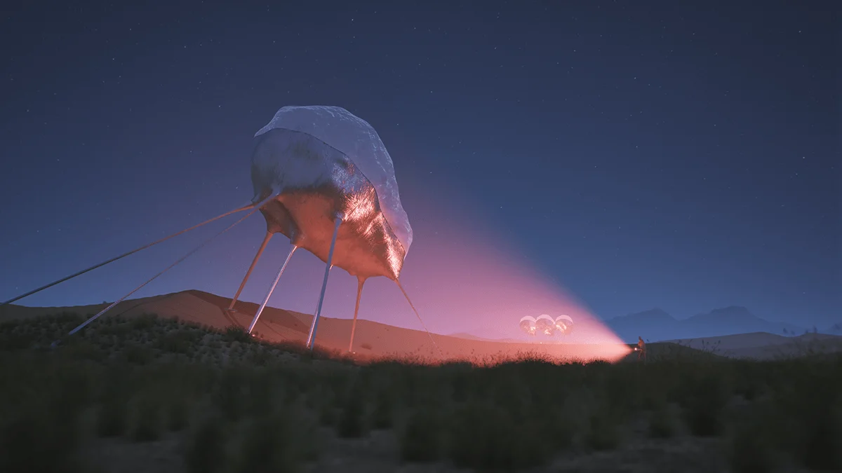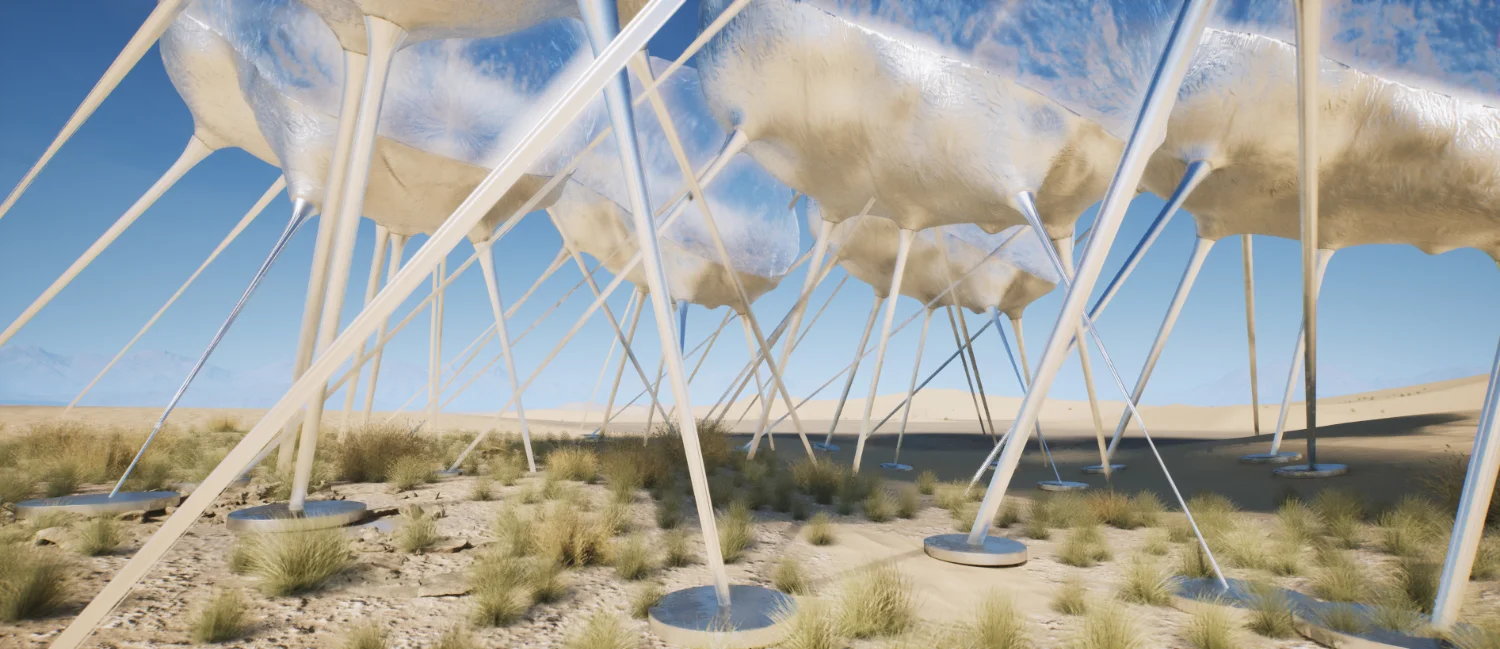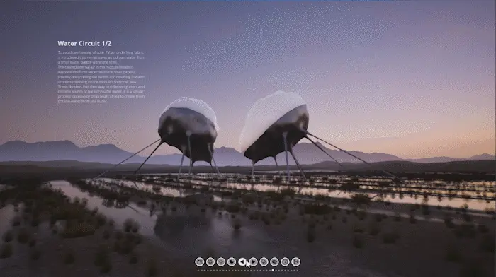 The module is made of key components: a base support structure and a changing outer skin on top. The skin or the bubble on the top expands or contracts as a direction function of what it needs to do, how much energy it needs to capture, how much water it needs to filtrate, how much shade it needs to provide to the people below, etc.