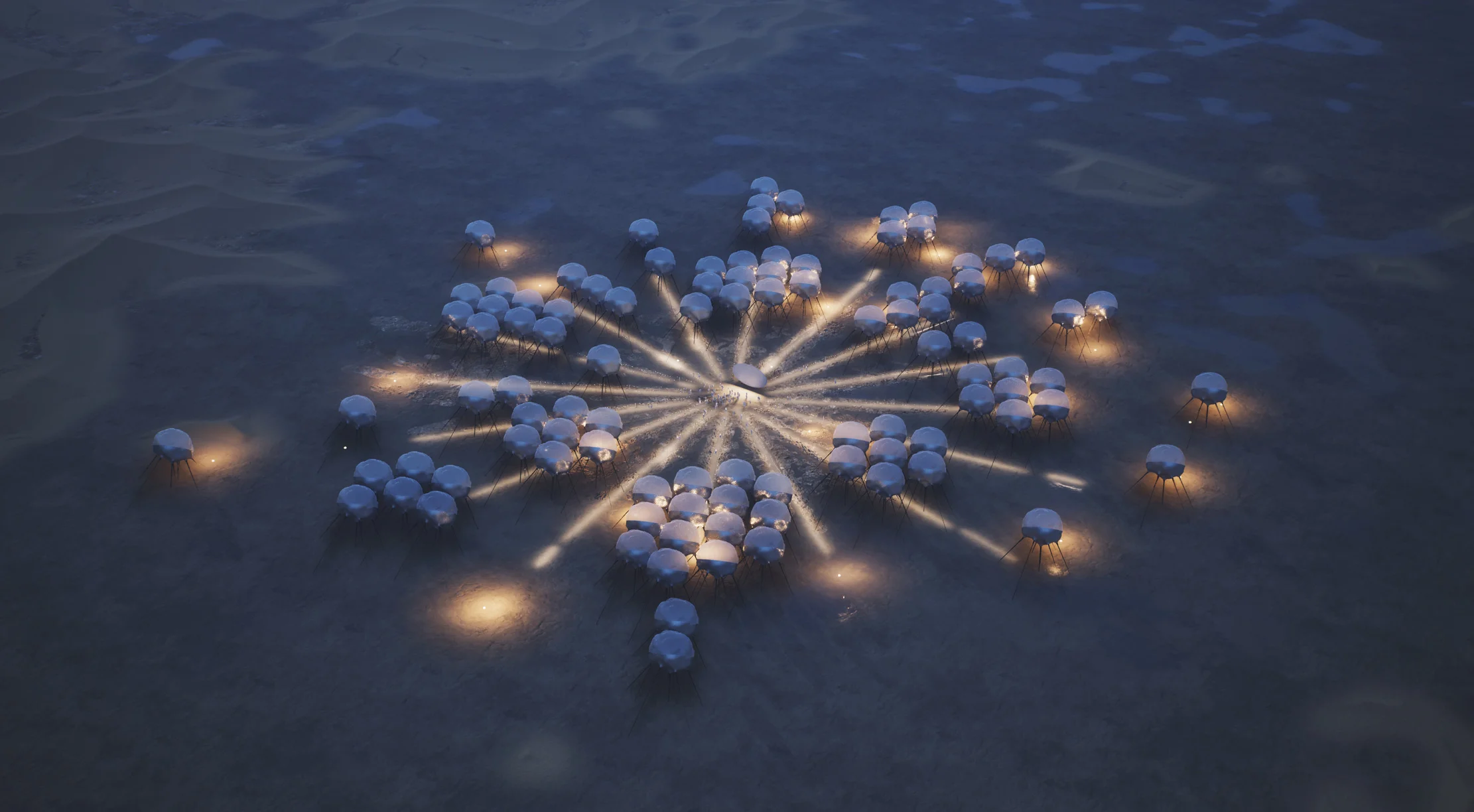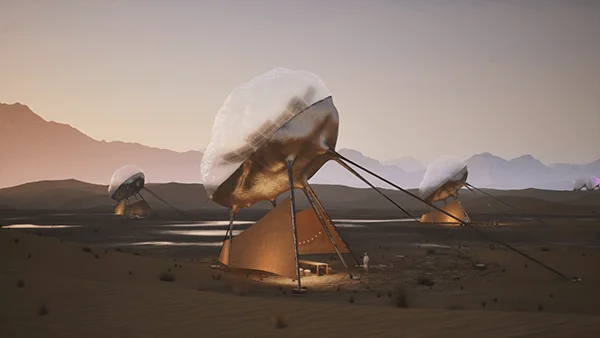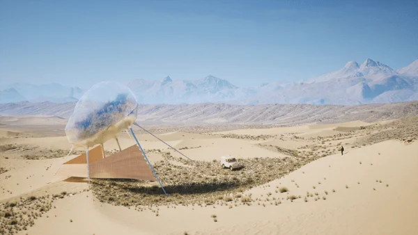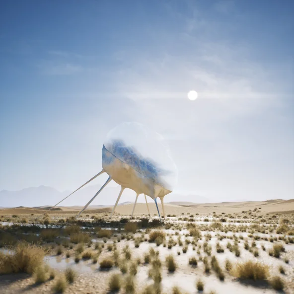 Self-supporting object that is able to provide energy, water and sun protection to its users in any remote location where it is located. The idea is that the prototype is not only a communal resources collector, but also a sculptural and iconic element that will work as a gathering point for people from the area and users in general.