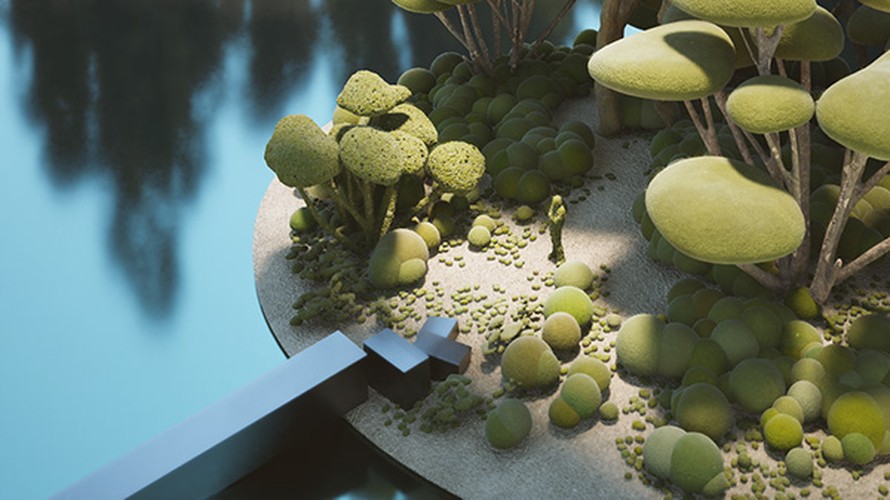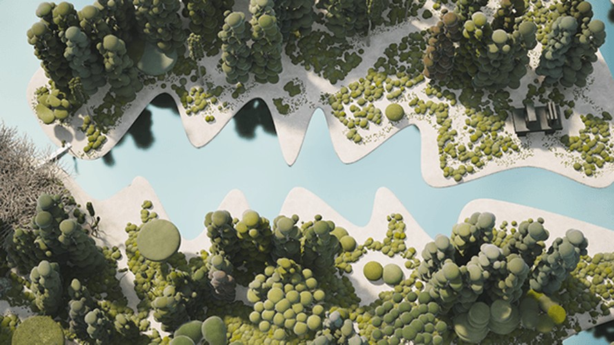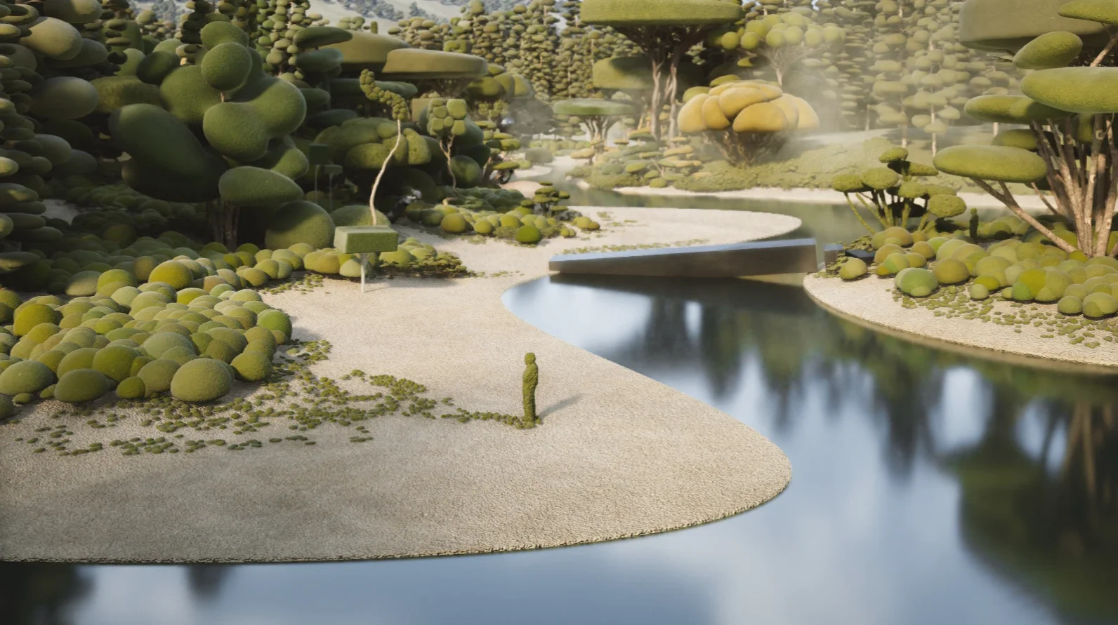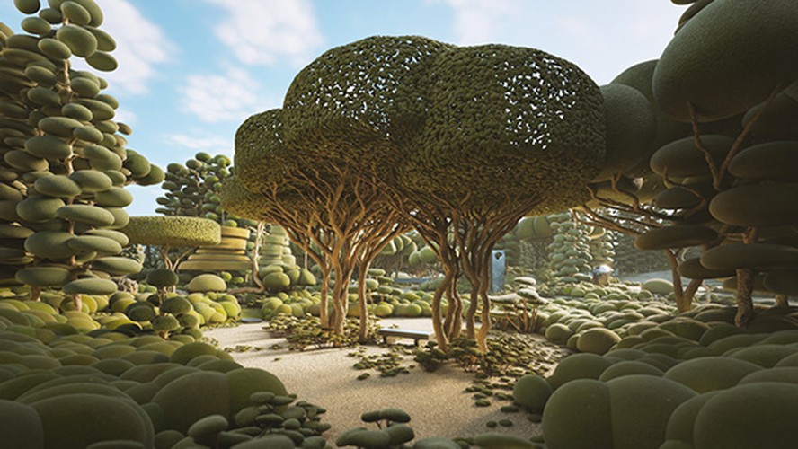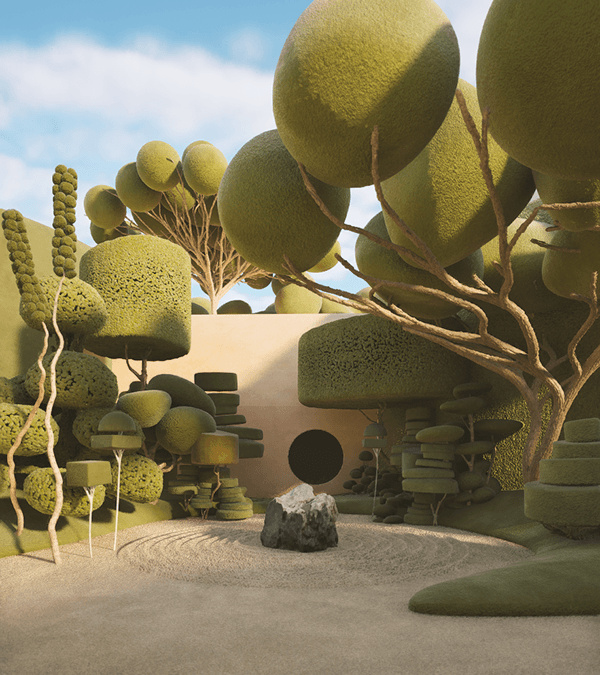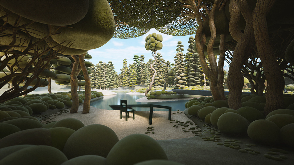 We created our vegetation, drawing inspiration from topiary pruning techniques. Each tree and plant is a sculptural element with a surreal and playful appearance. As we combined and populated them throughout the project, these ‘natural’ spaces, like forests and parks, emerged